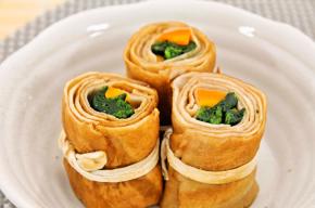 野菜を板麩で巻いてヘルシーに! 焼くときは、油でしっかり揚げ焼きにするとおいしくいただけます。