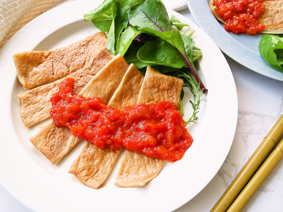 ガーリック風味に焼いた板麸とトマトソースの酸味が絶妙な、電子レンジで手軽に作れる庄内麸ステーキレシピ。板麸の戻し加減でジューシーにもサクッと食感にもお好みでどうぞ。