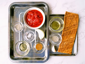 - 耐熱容器に<トマトソース>の材料をすべて入れ、混ぜる。ふんわりとラップをし、電子レンジ(600w)で4分加熱したらCにかける。
