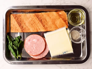 - 板麸の切り口を軽く開き、ハム・スライスチーズ・バジルを中に挟み、爪楊枝で端を止める。