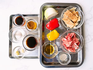 - 豚肉はひと口大に切り、塩こしょうで下味を付ける。玉ねぎは幅1cmのくし形切り、パプリカは幅1cmの薄切りにする。