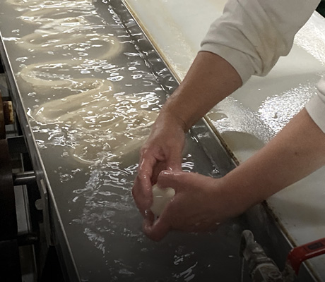 流水の中で長いひも状に成形するのは手作業、