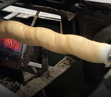 棒状に巻き上げられた麸は、焼き工程で直火で焼きます。