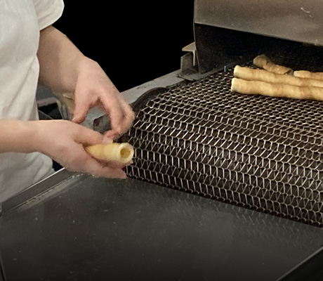一定の幅に成形された生地を棒状に巻く際の角度が重要で、棒状に巻き上げたときの重なりや焼き上がりに影響する。