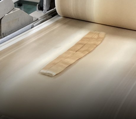 乾燥された麸に蒸気が吹きかけて柔らかくしプレス、平にして板麸の状態に加工します。