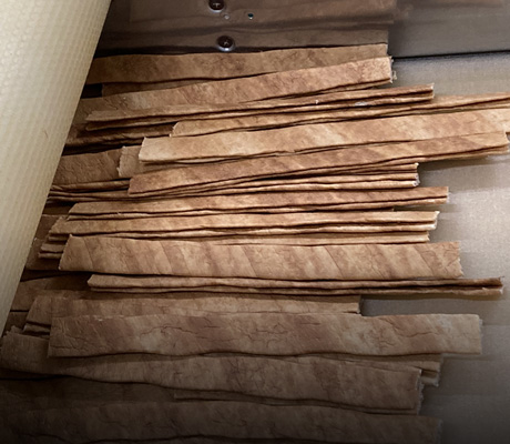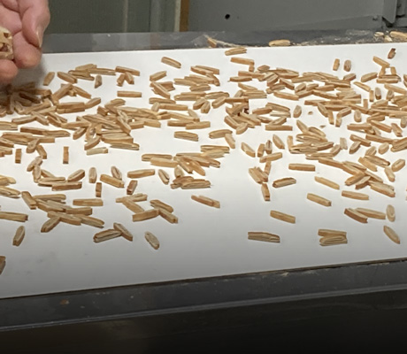乾燥された麸を細かくカット、不適合のものを人の目でチェックして除外します。