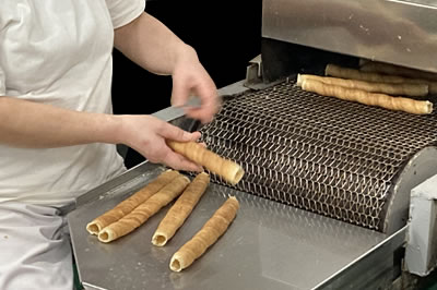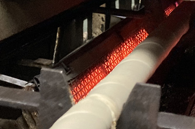 手作業では非常に手間のかかる製法ですが、香ばしい焼麸を作るには欠かせない工程です。当社では、製造ラインの機械を自社で設計し開発、本来の手づくりの伝統的な風味、味わいを活かし、安定した商品を量産する体制を構築しています。